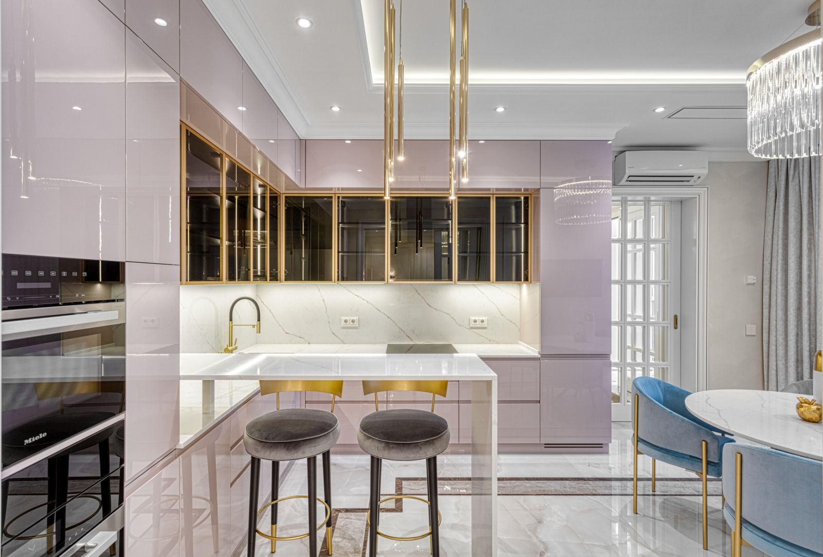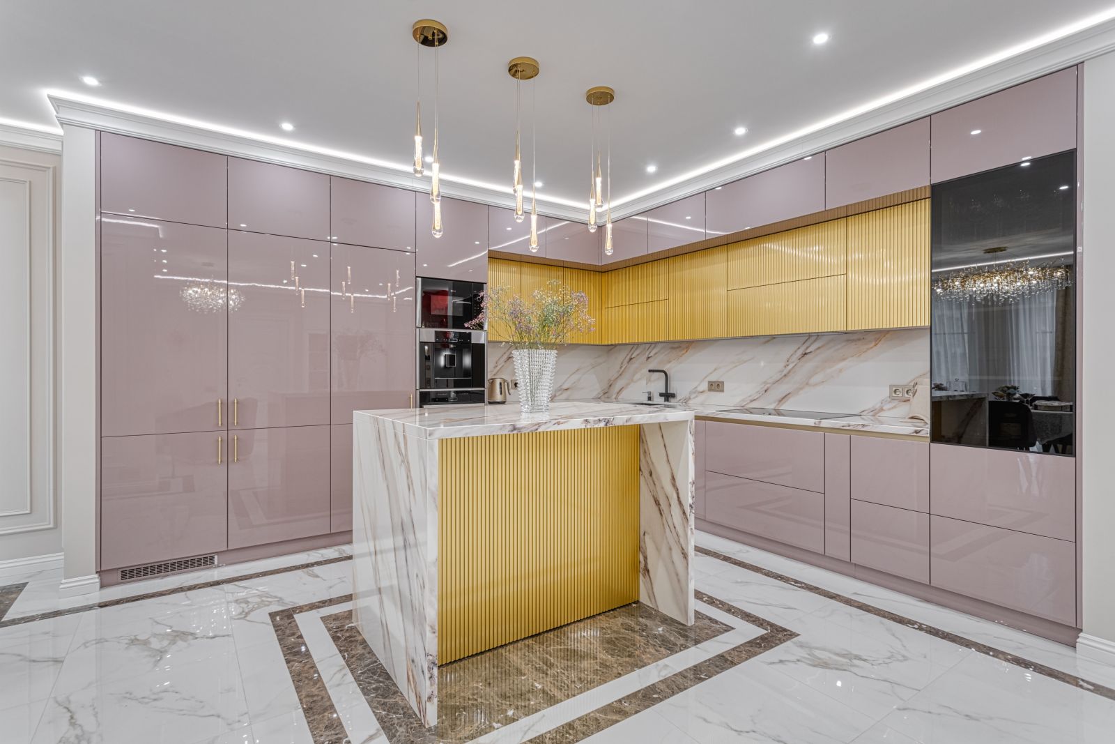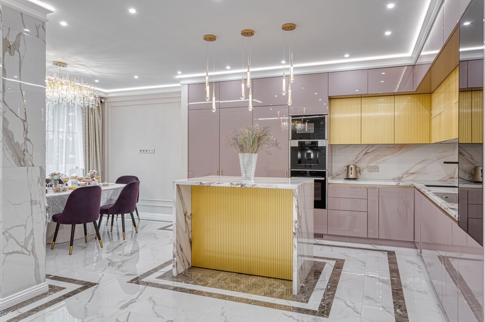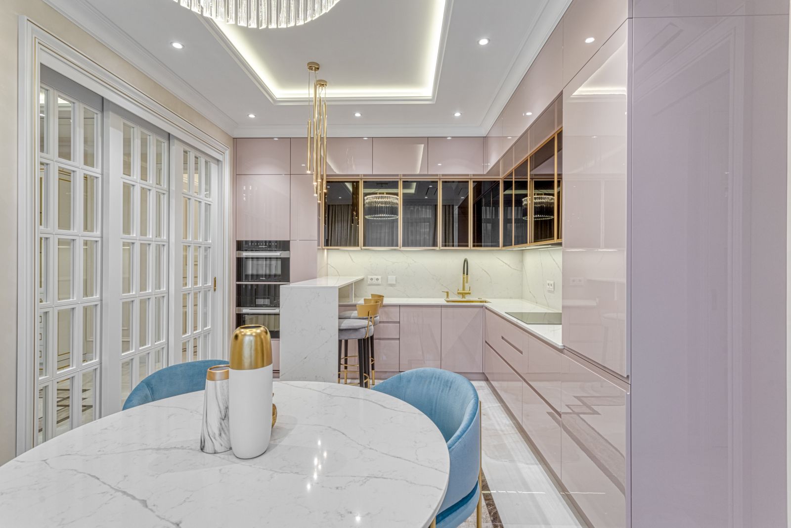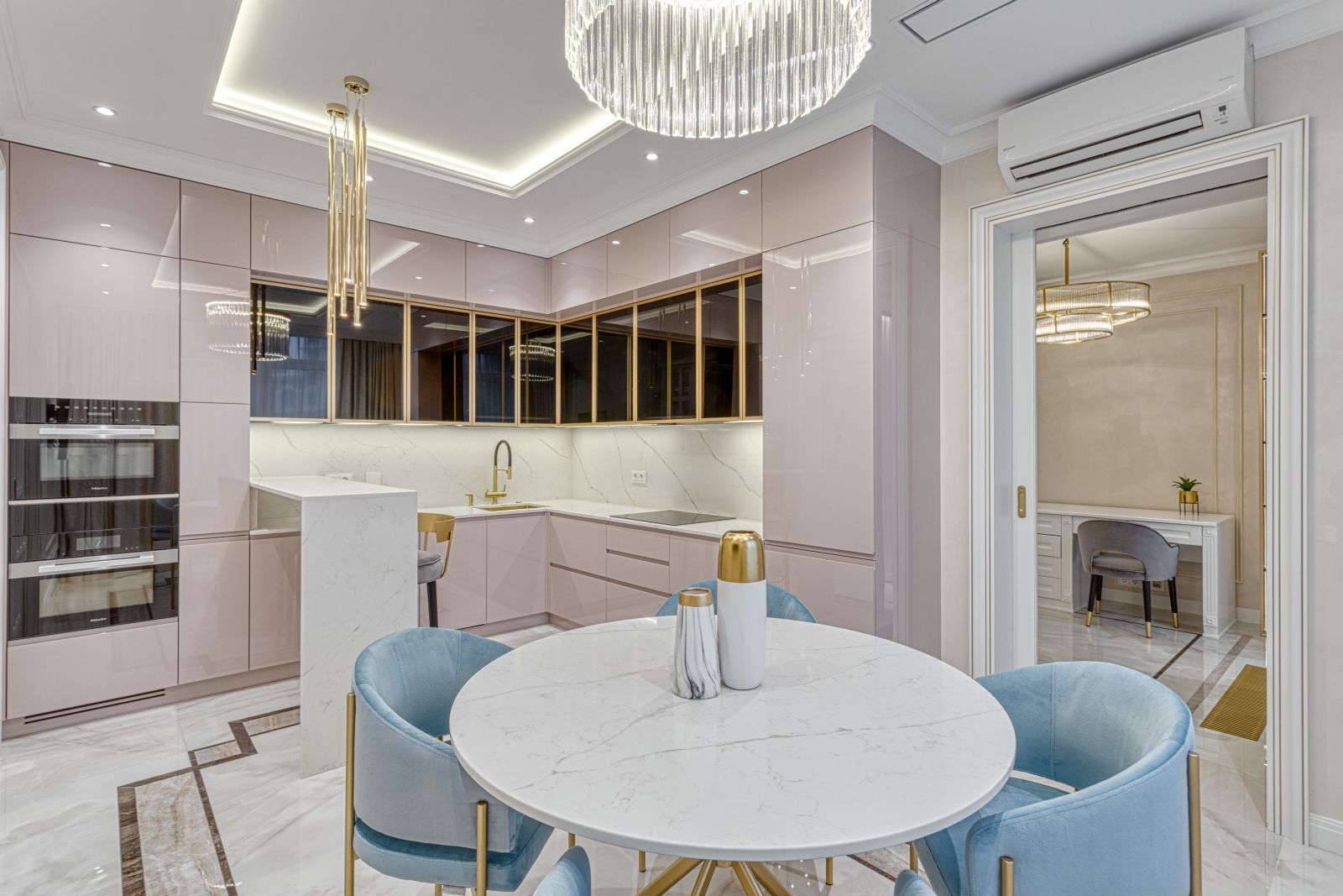 - Проект выполнен в стиле современной неоклассики с элементами гламура. Основная идея — создать роскошное, но функциональное пространство, где каждая деталь подчёркивает статус и вкус владельца. Ключевой акцент — сочетание белого мрамора, золотых элементов и мягких пастельных оттенков.