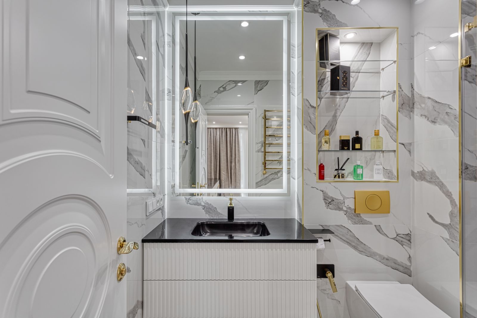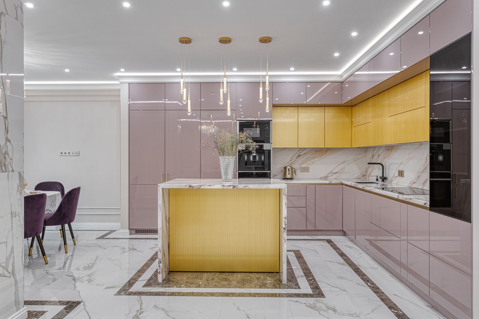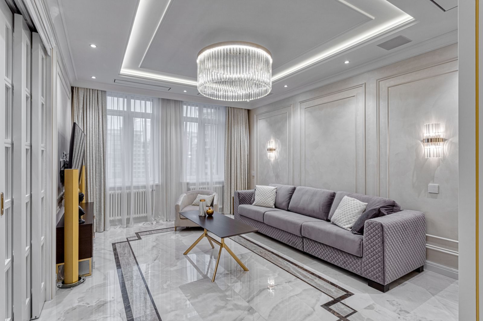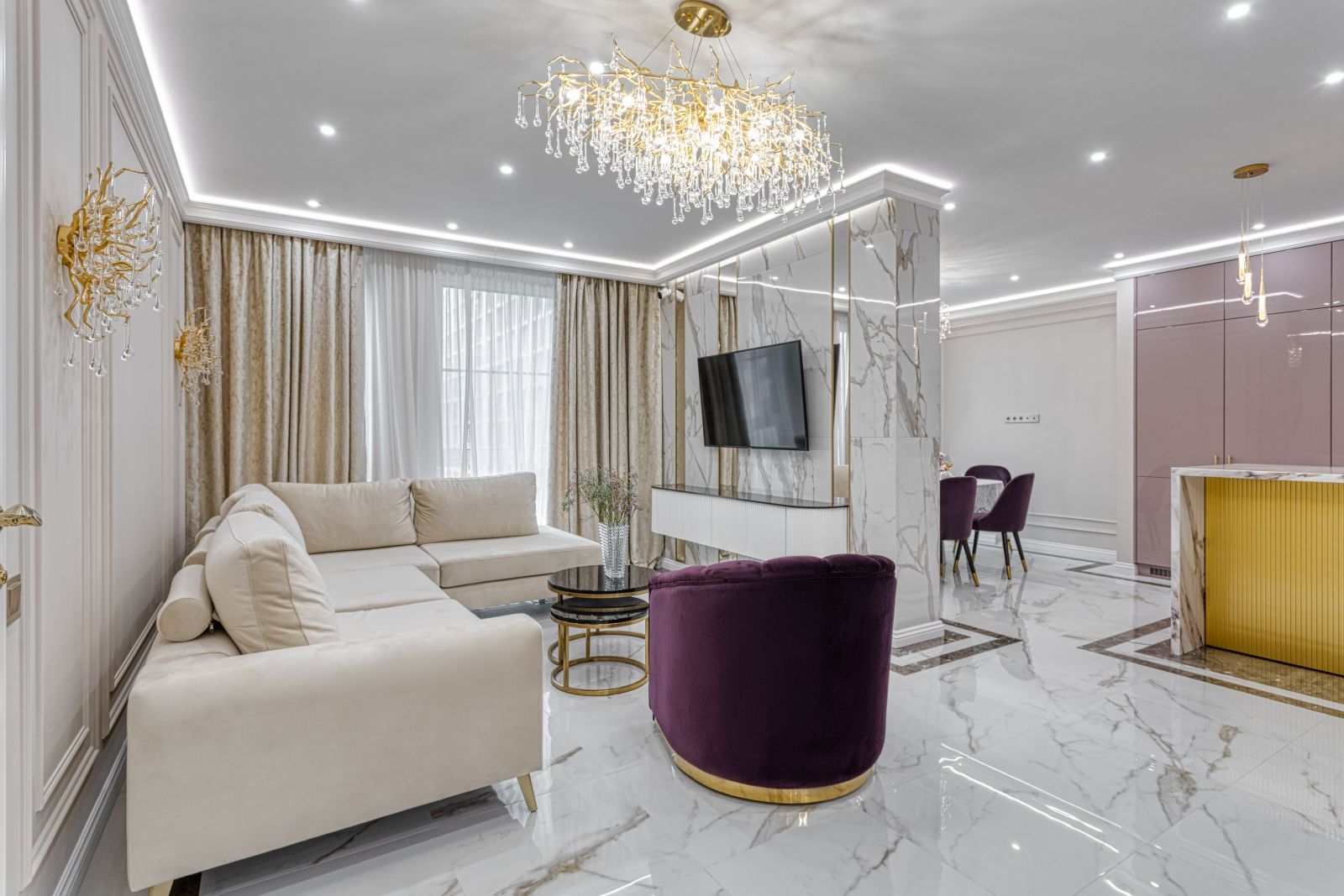 - Проект выполнен в стиле современной неоклассики с элементами гламура. Основная идея — создать роскошное, но функциональное пространство, где каждая деталь подчёркивает статус и вкус владельца. Ключевой акцент — сочетание белого мрамора, золотых элементов и мягких пастельных оттенков.