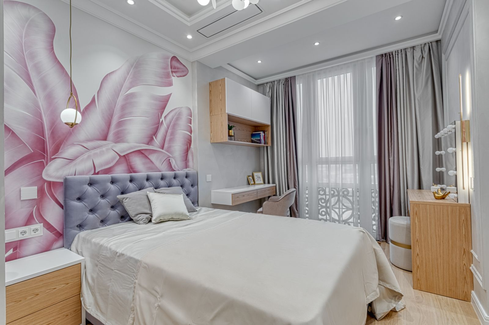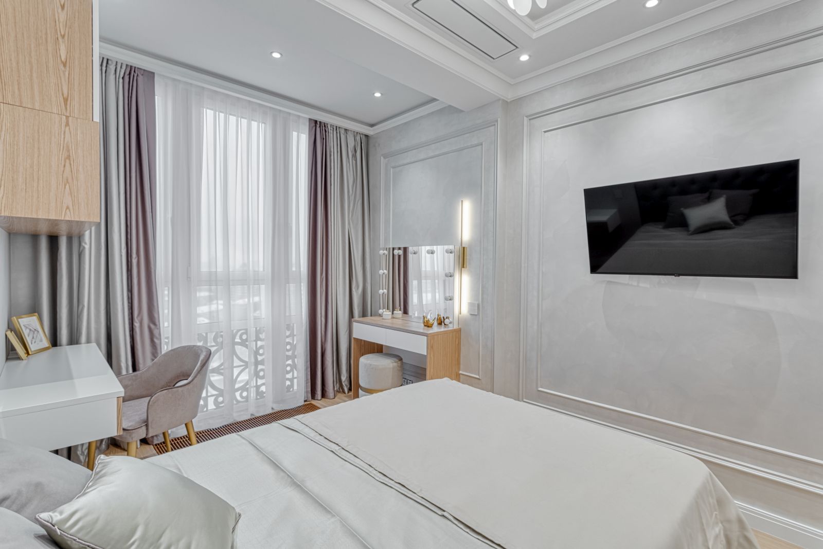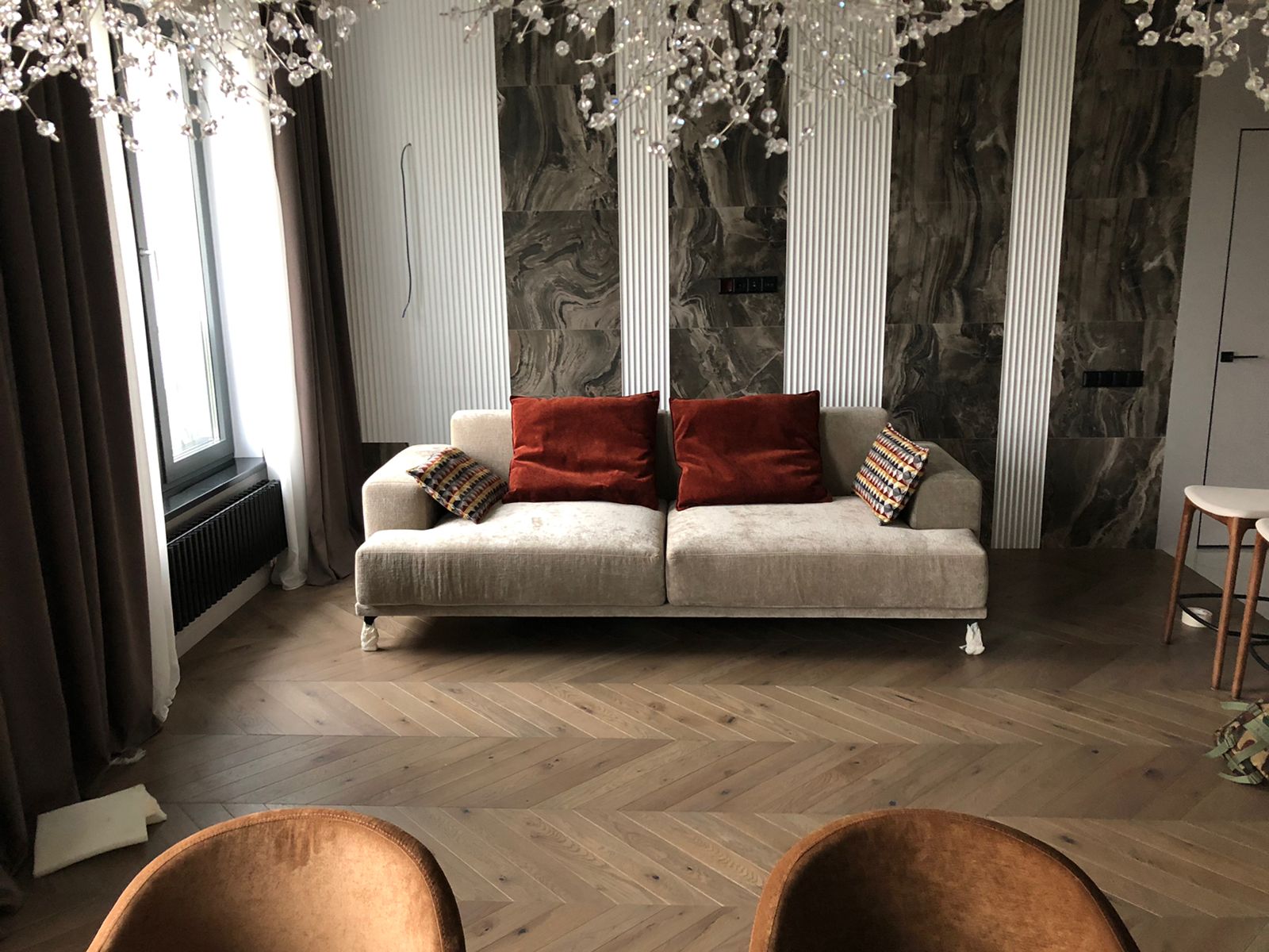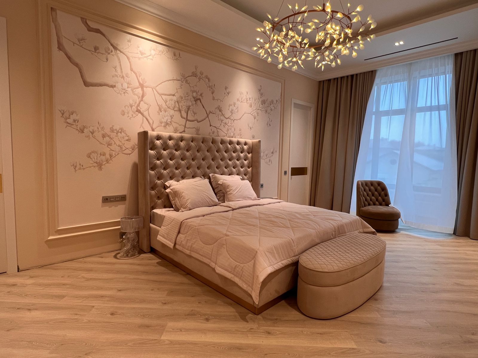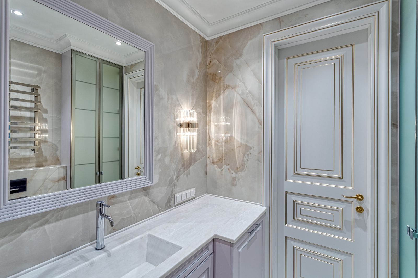 - Проект выполнен в стиле современной неоклассики с элементами гламура. Основная идея — создать роскошное, но функциональное пространство, где каждая деталь подчёркивает статус и вкус владельца. Ключевой акцент — сочетание белого мрамора, золотых элементов и мягких пастельных оттенков.