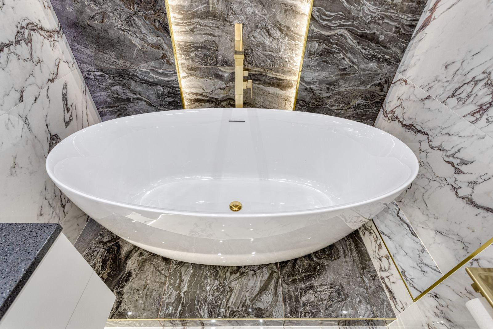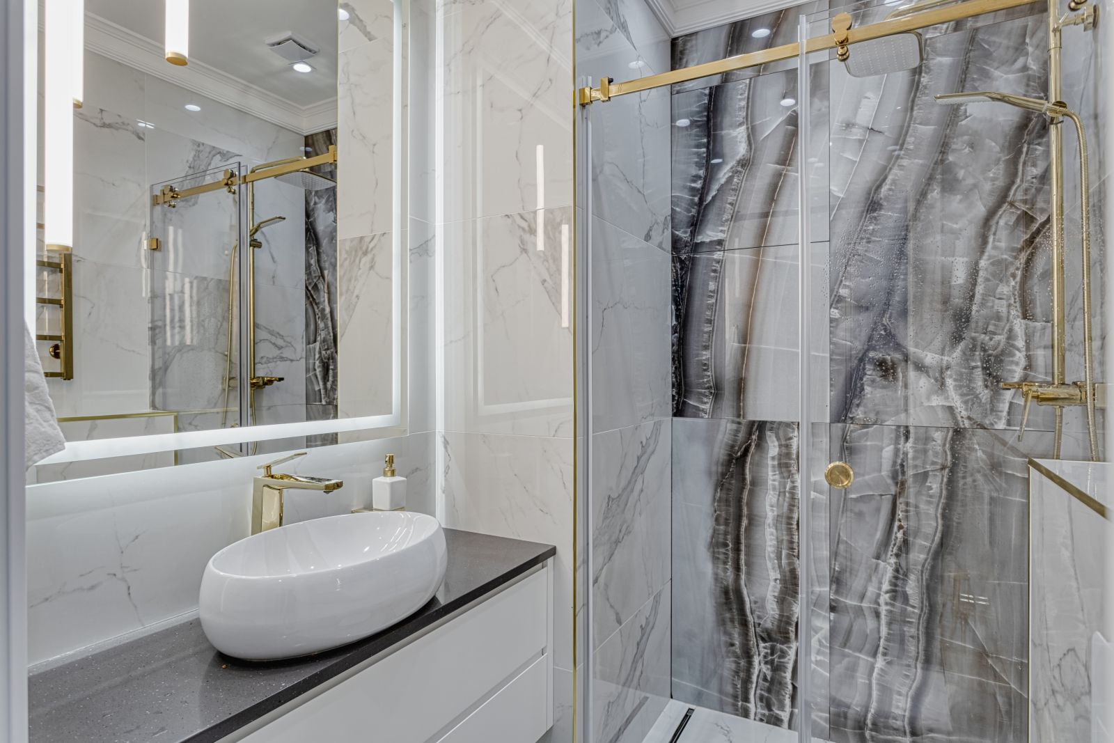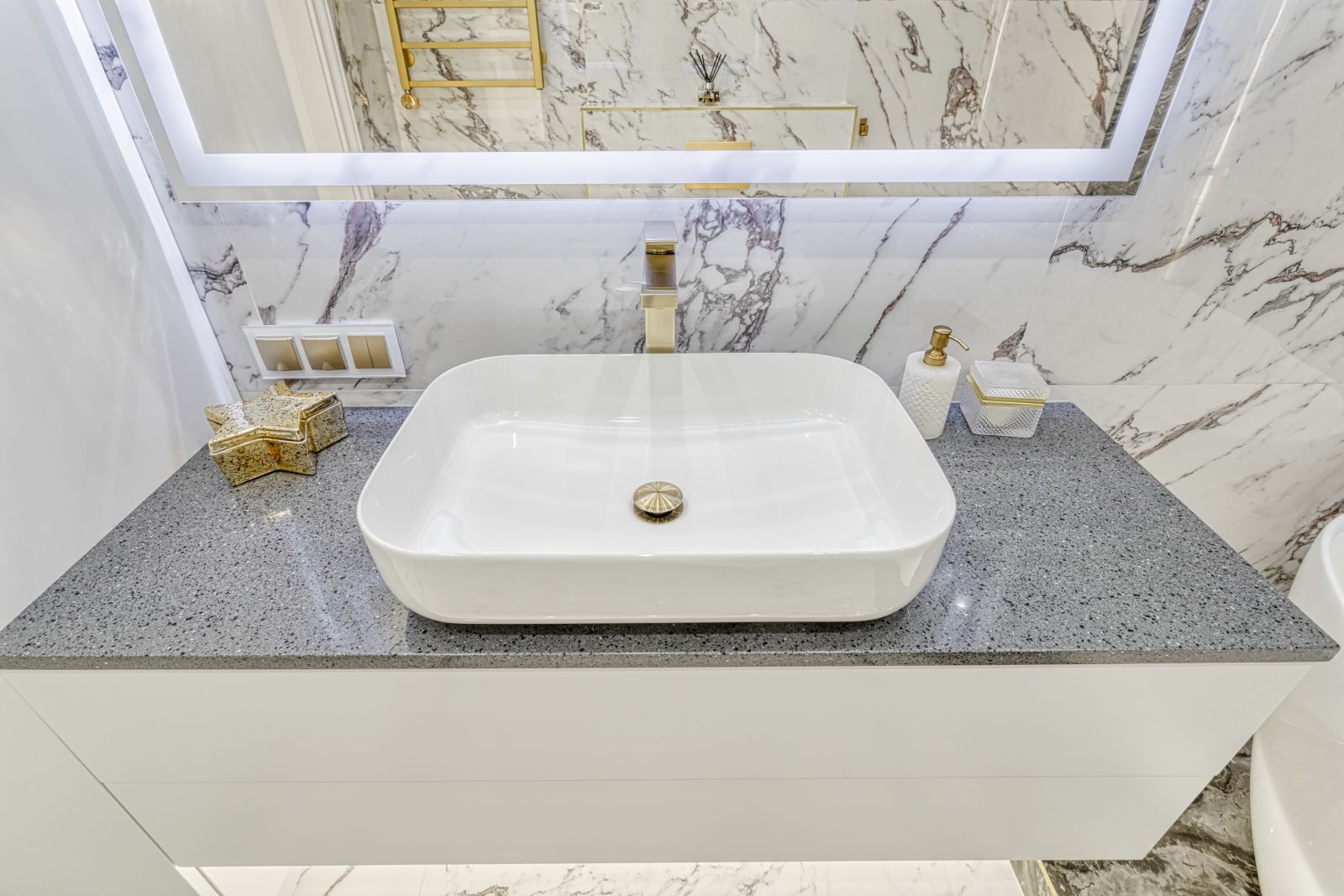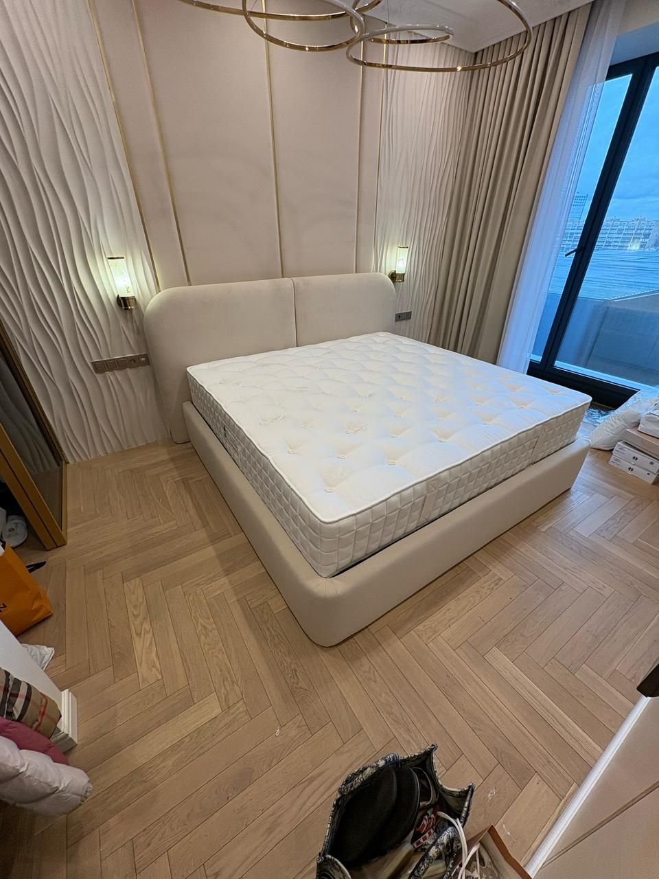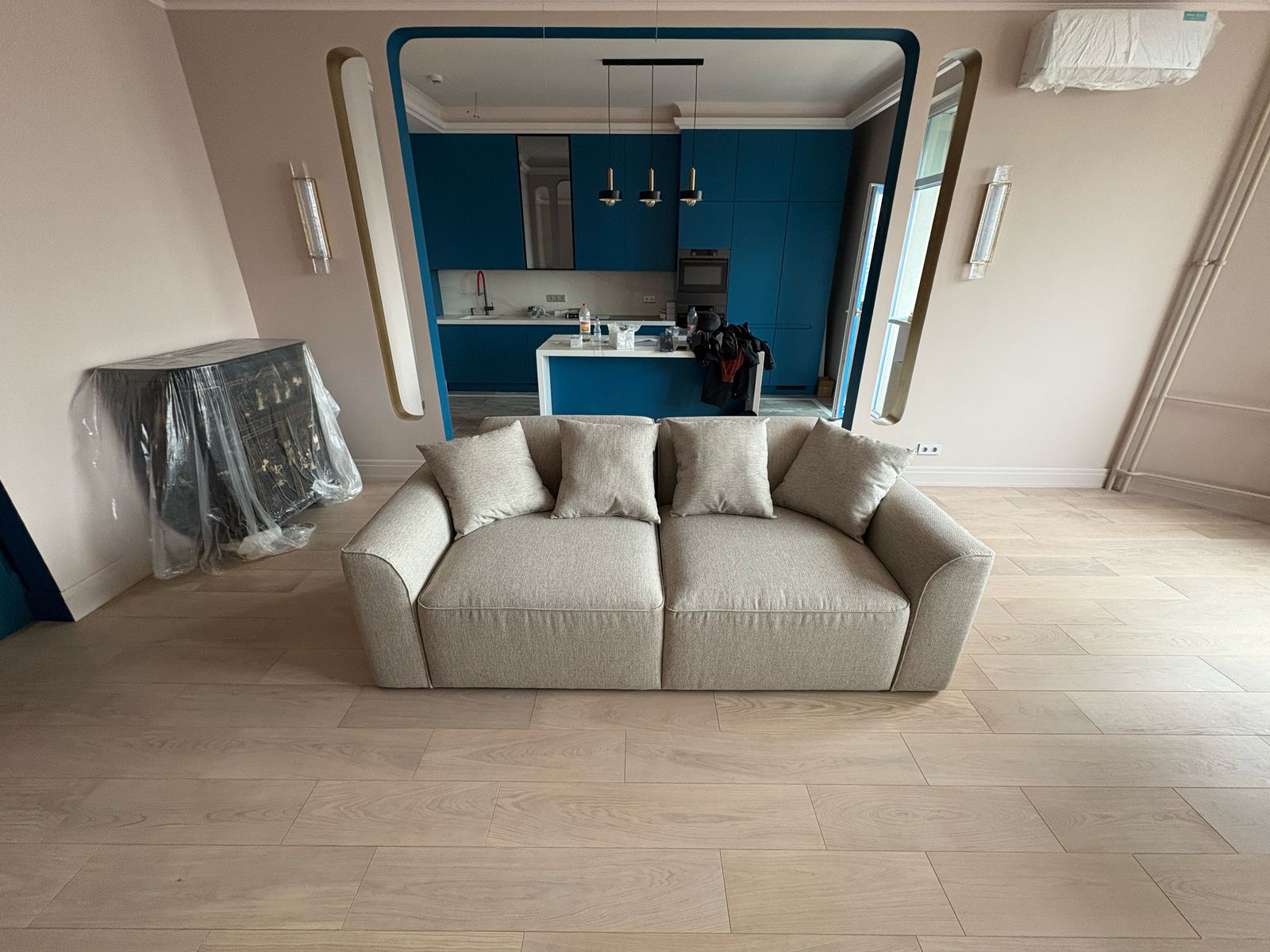 - Проект выполнен в стиле современной неоклассики с элементами гламура. Основная идея — создать роскошное, но функциональное пространство, где каждая деталь подчёркивает статус и вкус владельца. Ключевой акцент — сочетание белого мрамора, золотых элементов и мягких пастельных оттенков.