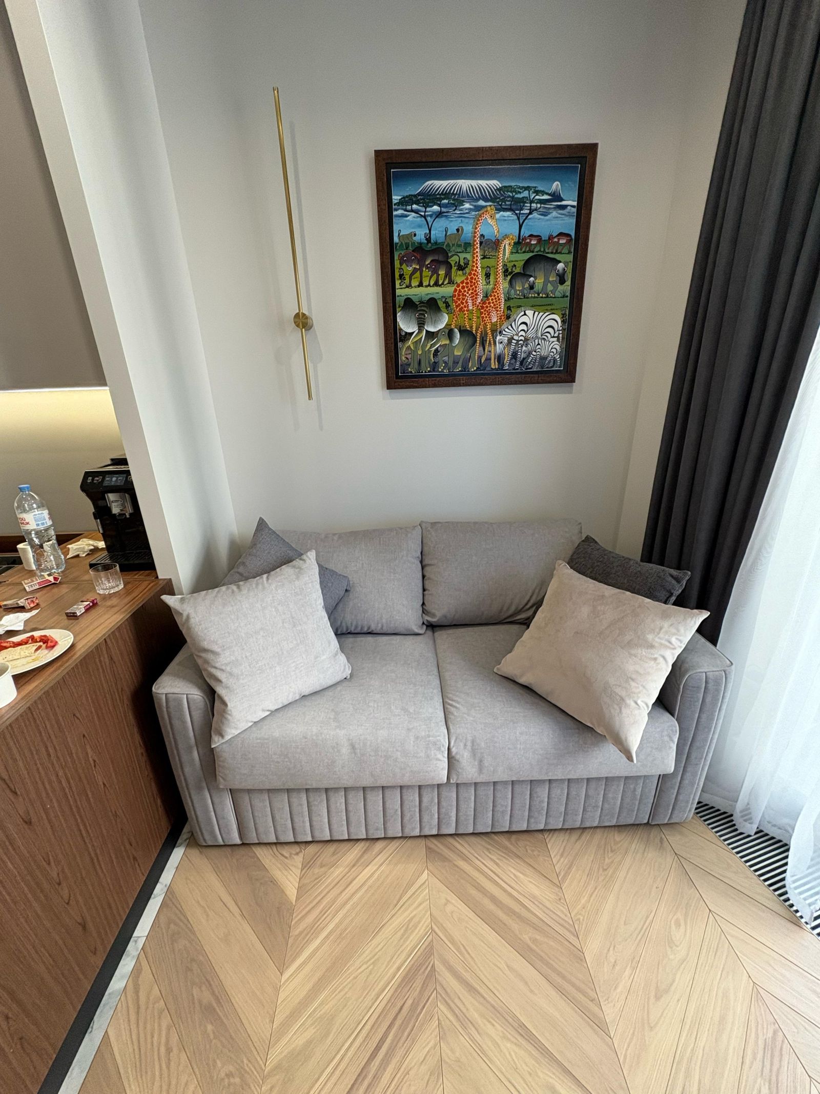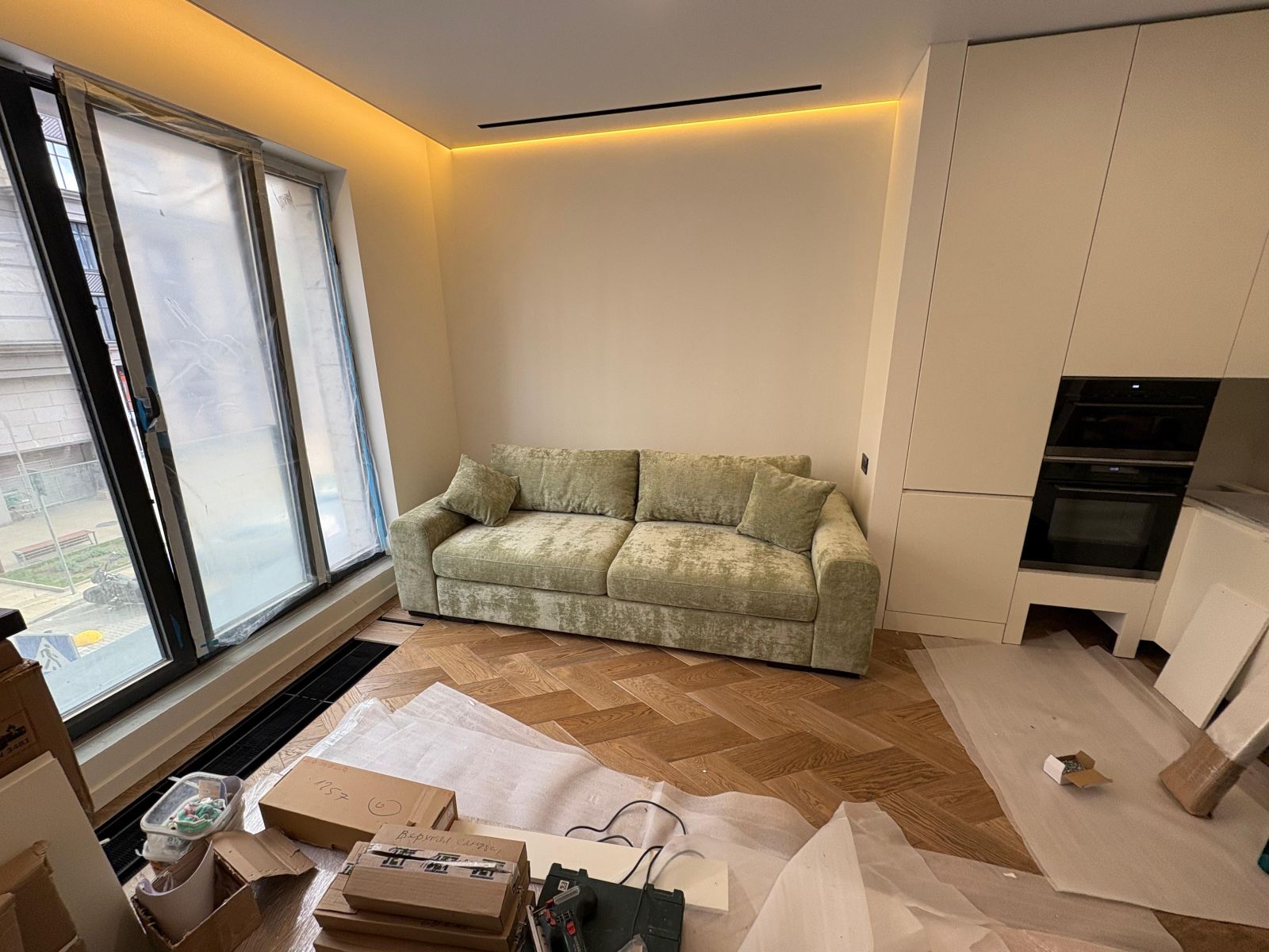 - Проект представляет собой современный совмещенный интерьер кухни и гостиной с четким зонированием. Дизайн сочетает минимализм и элементы классики, создавая уютное, но стильное пространство. Основная цветовая гамма - светлые оттенки дерева, белый и серый, что визуально расширяет помещение и добавляет легкости.